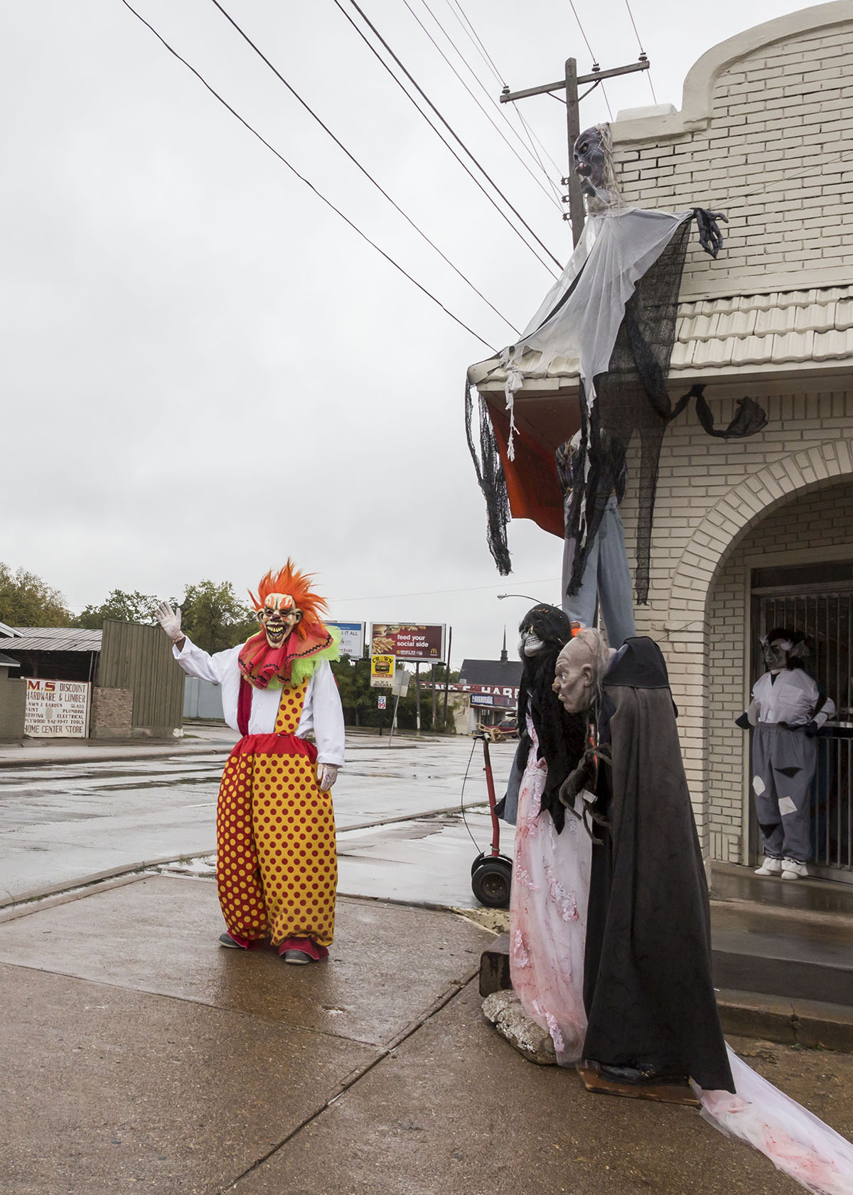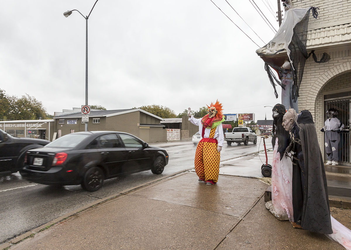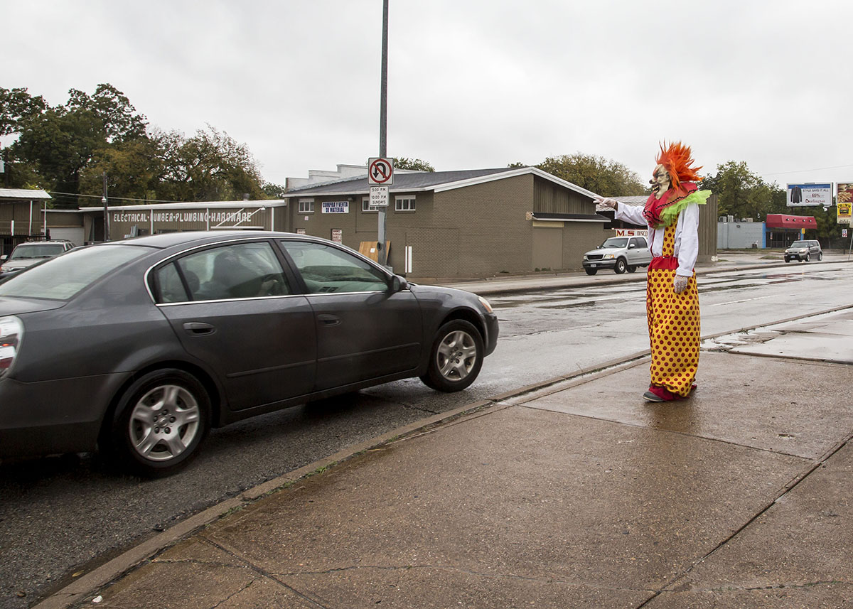 What looks like a homicidal clown greets commuters on Hampton Road each morning, and in the evening, there could be a masked chainsaw killer or a Michael Myers lookalike.