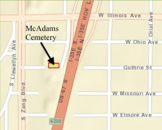The McAdams Cemetery is just off the Interstate 35 service road, south of Illinois.