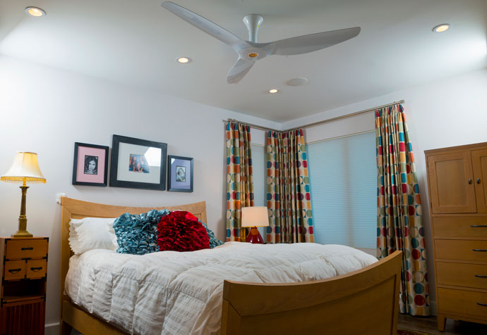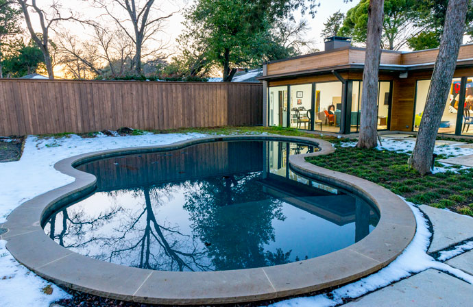 Boorhem hired her brother’s design-build firm, ArTex Development, to renovate her new house. First, the heavy stuff: They rebuilt the roof with a slope so that it drains, and they installed new ceiling beams. Exterior stucco was replaced with cedar plank for an updated façade that looks far more contemporary. It took about a month of jack-hammering into the slab foundation to change the sewer line, and they installed foam insulation for energy efficiency. ArTex reconfigured the floor plan so that the kitchen would open to the dining room and living room, with floor-to-ceiling views of the backyard. They replaced all the windows with thermal ones similar to what you would find in a modern commercial building. “There are probably not too many people who would’ve gone to the lengths Harriet has to restore this house,” says Mitch Lee of ArTex. Then, the fun stuff: They chose engineered wood flooring throughout the house and reconfigured the kitchen, installing sleek white cabinetry and Silestone countertops. For the master bedroom, ArTex designed Boorhem’s “dream closet” and replaced the subway-tiled ’50s bathroom. A walk-in shower behind a glass wall requires no step up, which is a signature of ArTex, and Boorhem thinks it’s perfect for a single lady planning to live there into old age. They replaced the old pool and installed a sundeck. As a final touch, they hired Eco High Fidelity for audio/video automation. Boorhem’s brother, Ross, insisted on the high-tech touch for a truly modern house, even though she says she’s still learning how to use it all. The renovations took about 13 months. “The timing was just perfect,” Boorhem says. “It’s a new chapter of my life in Oak Cliff.”