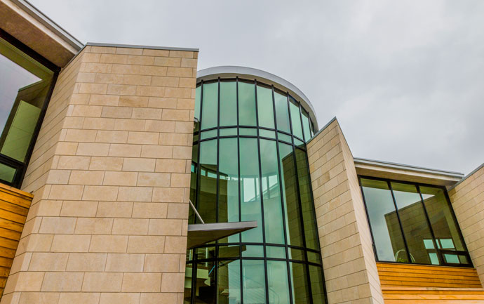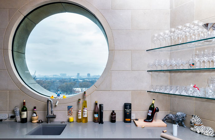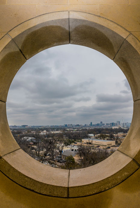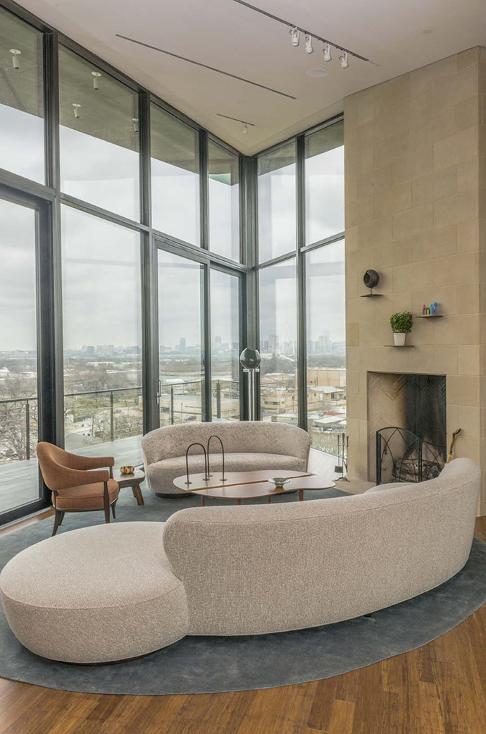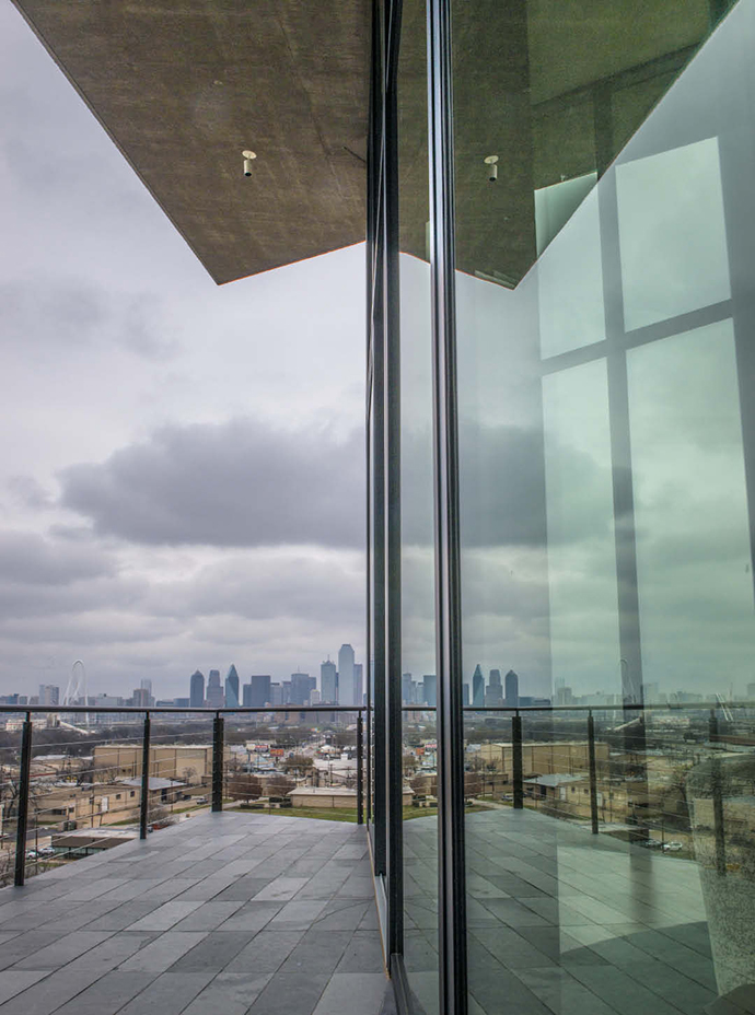 Four massive stone pylons define three spaces within the home. One of the three stories is below street grade, keeping the house in scale with its two-story neighbors. Walls of glass define the north and south edges between the pylons, creating a downtown view from every room in the house. From her bedroom, Cook can watch the progress on construction of the Santiago Calatrava-designed bridge named for her mother, Margaret McDermott.
