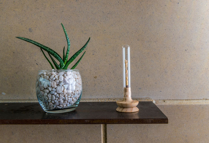The flooring is made of bamboo, and the countertops are made of recycled materials, including glass and concrete.