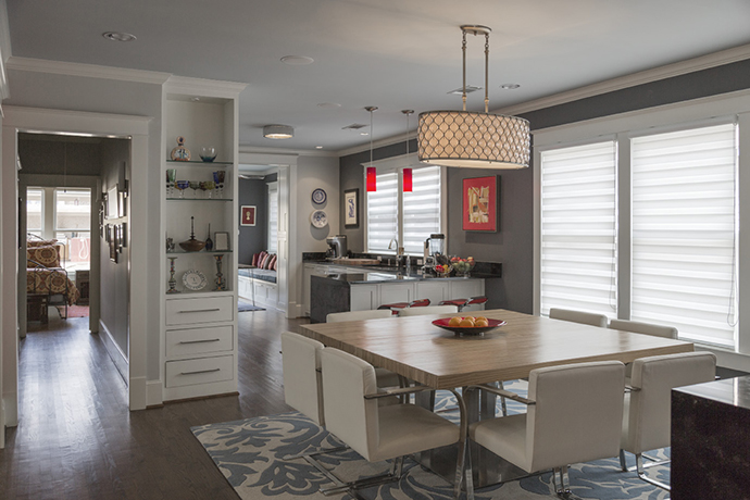 The kitchen dimensions didn’t allow enough space for a center island, so the homeowners created a peninsula between the kitchen and dining rooms. The dining room table is made from the home’s original heart-of-pine floorboards. Photo by Jeanine Michna-Bales