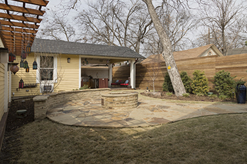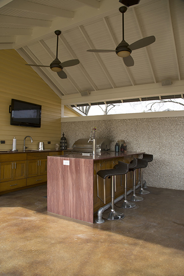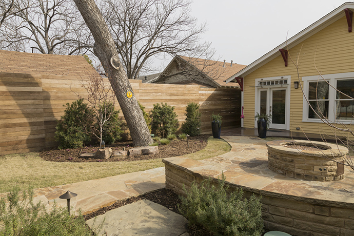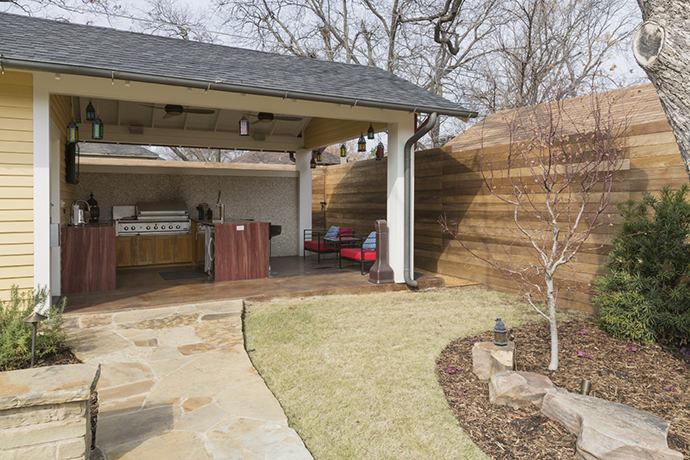 In the center of the backyard is a small patio with a built-in fire pit and a semi-circular stone ledge. This is where you’ll find the last-to-leave, late-night guests of a Baca-Breedlove party. Beyond that is an outdoor bar with two keg coolers and a wine cooler.