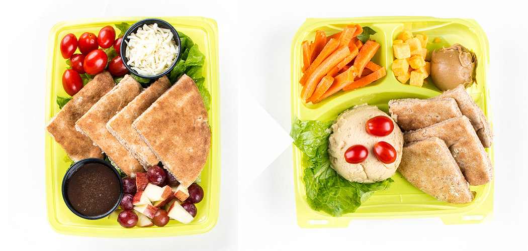 The school lunch version of a bistro box will be a new choice this year in addition to hot entrées. Students can opt for the “harvest salad” box (pictured at left), the “protein power pack” (at right) or other pre-configured lunches with wraps and sandwiches. Like the new lunch plates, the smart boxes are compostable.