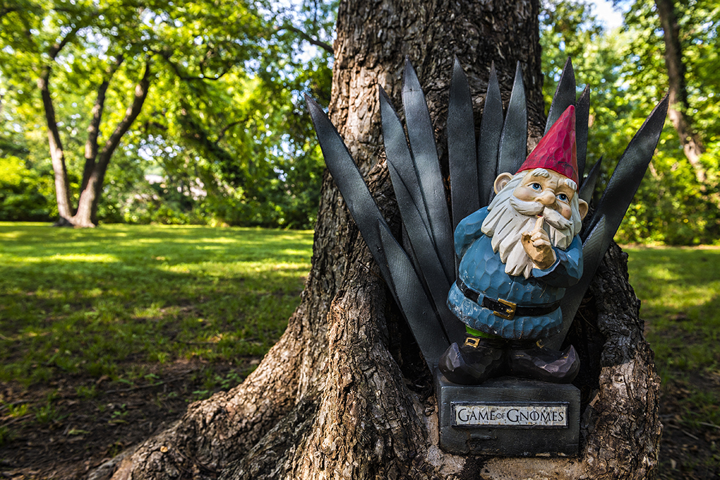 More recently, a carved gnome statuette appeared sitting in a miniature iron throne ala “Game of Thrones.” It’s unclear whether that is the work of the same artist who created the doors.