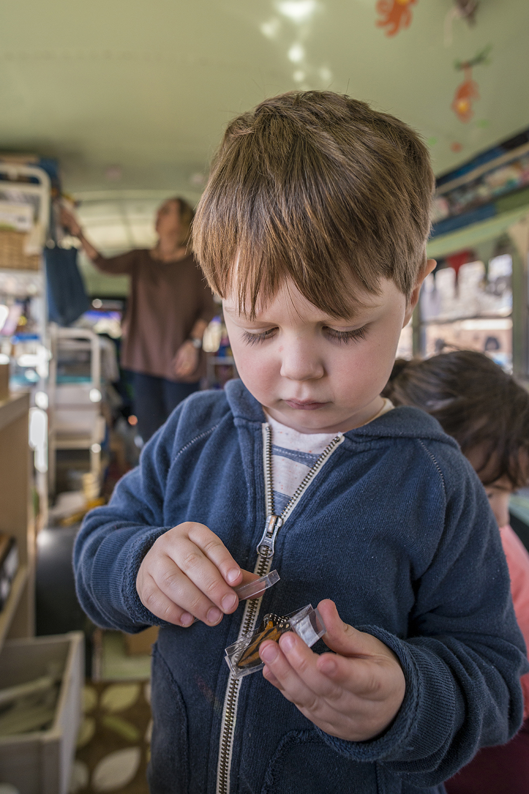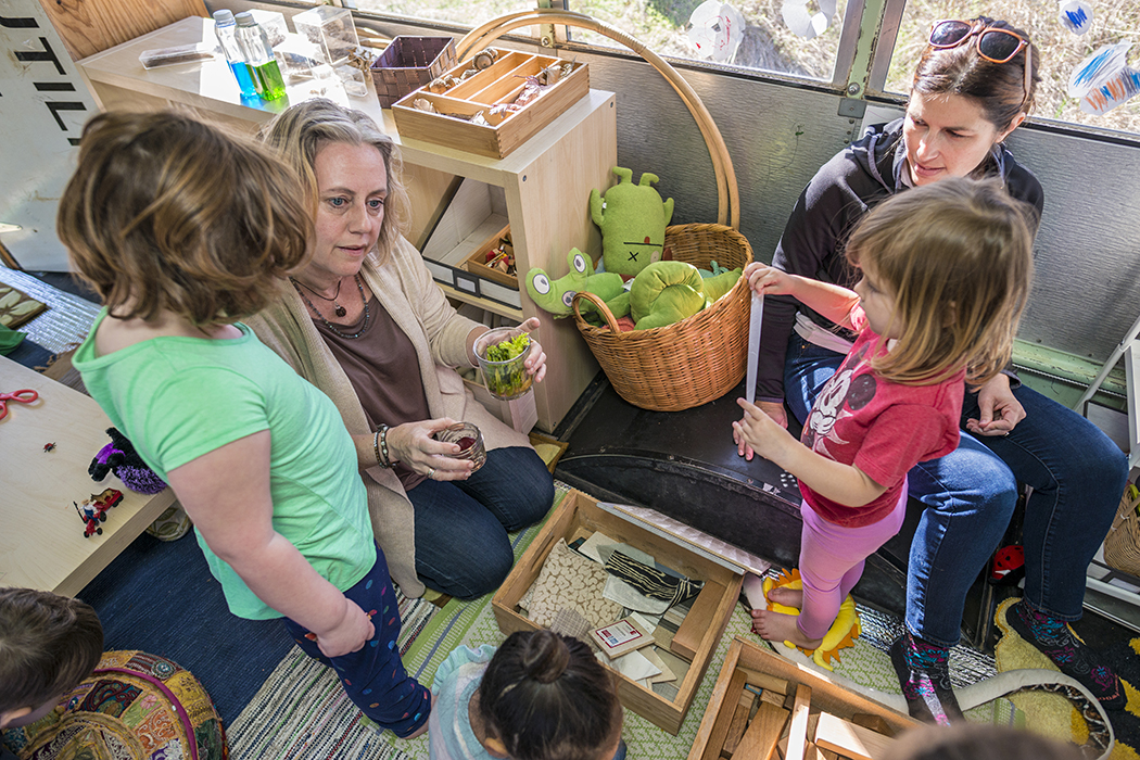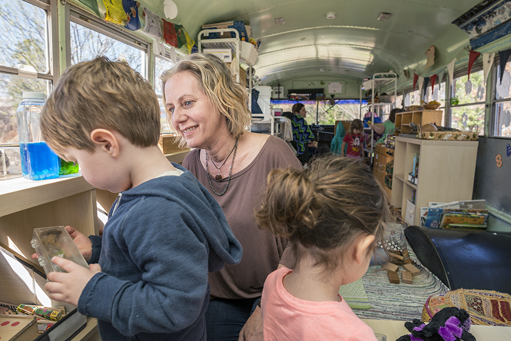 Seed Preschool teacher and owner Jennifer Stuart works with students on her moveable classrooom, a bus named Matilda. Photo by Danny Fulgencio