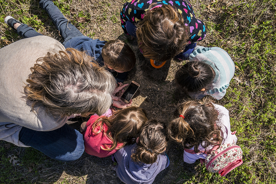 Once students arrive, sans electronic tablets, phones and laptops, they join their teacher outside for a fresh-air session of “trail hiking, collecting, observation and documentation,” Stuart says.