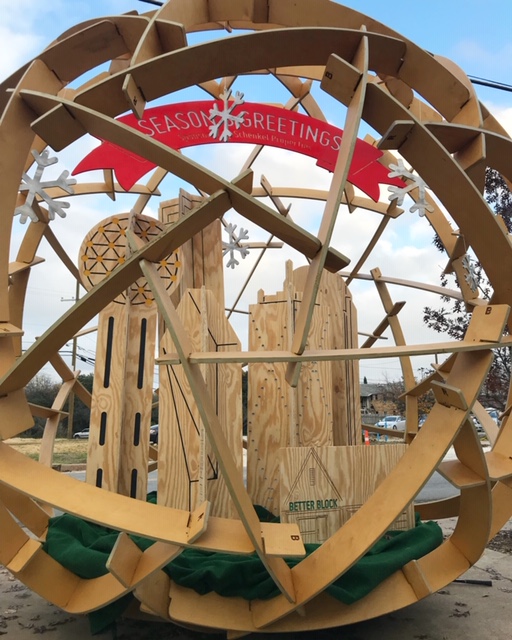 The geodesic dome was constructed from two repeated wood cuts made on a CNC router and put together like a puzzle. Better Block, the city planning nonprofit on West Davis, brought it to Fair Park’s Earth Day celebration. They used it as the “Death Star” in their May 4 Star Wars-themed design competition. They’ve used it as a stage for speakers and musicians. And now, it is Oak Cliff’s largest snow globe, probably.