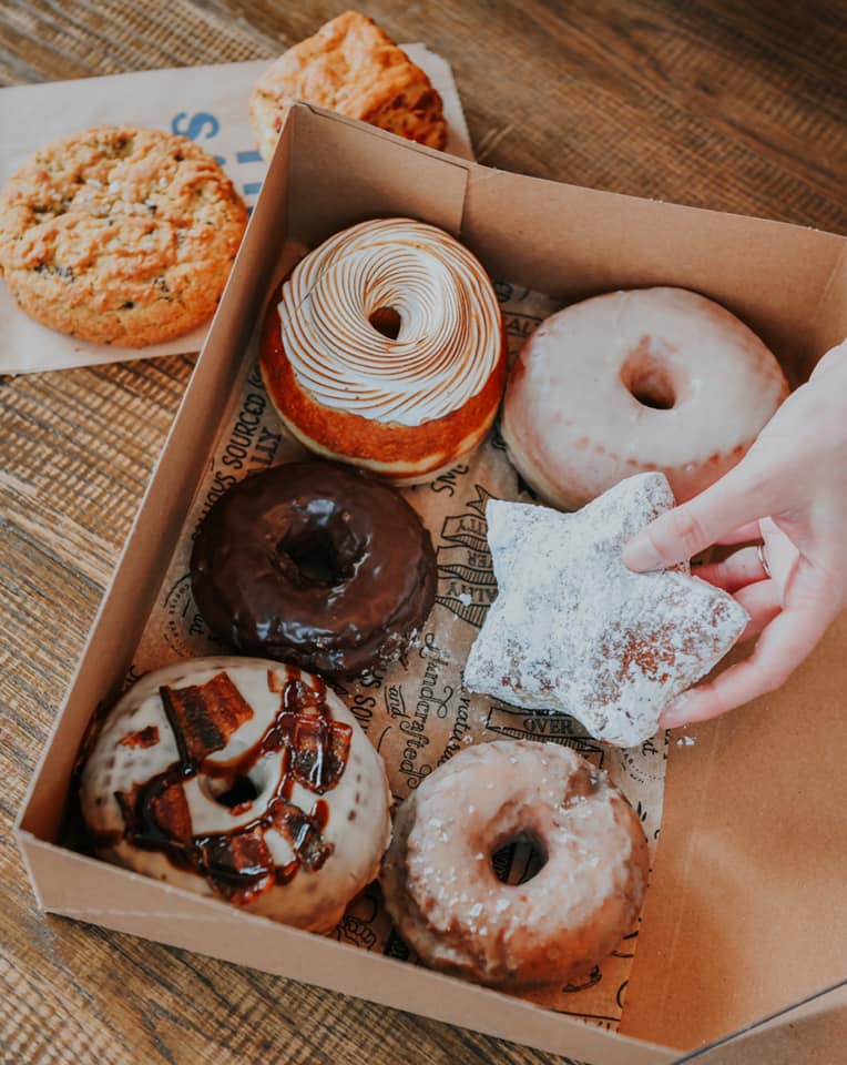 Most of their donuts start with 24-hour brioche dough and come in flavors such as horchata, maple bacon, and the Lone Star, a star-shaped jelly donut filled with ruby-red grapefruit curd.