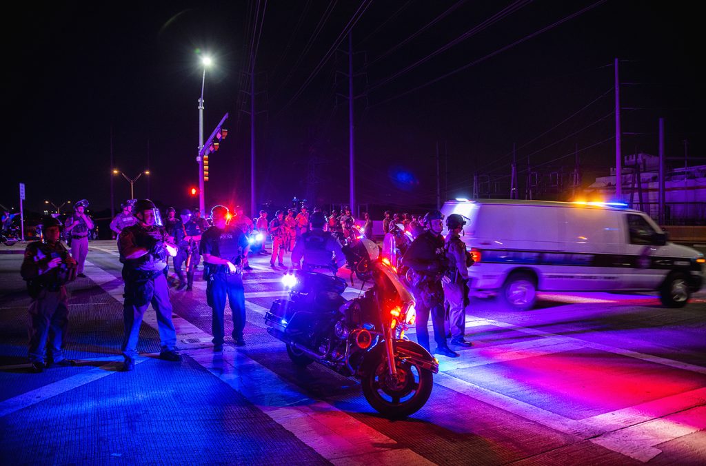 Later in the evening hundreds of protesters marched onto the Margaret Hunt Hill bridge when police positioned themselves in front of the group. After protesters made it on the bridge, DPD placed officers behind them, blocking them in. Police began arresting people for obstructing a highway, The Dallas Morning News reports.