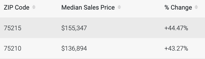 In 75215 and 75210, which are among the least expensive places to buy a house in Dallas, the median prices increased to $155,347 and $136,894, respectively in November. That’s represents an increase of over 44% and 43%.