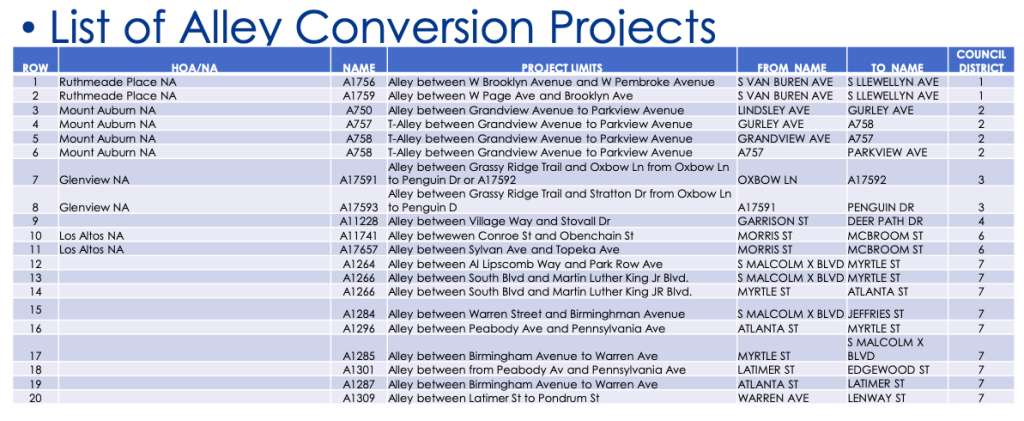 The City of Dallas has $4 million budgeted to convert these alleys, which are no longer used for trash and have few utilities. A city ordinance approved last year enables the city to enter maintenance agreements with homeowners.