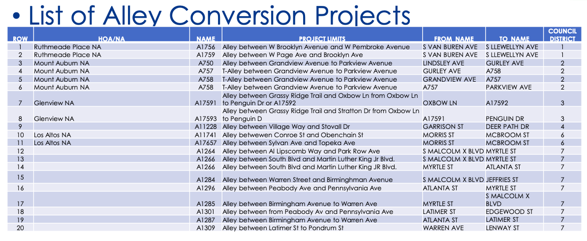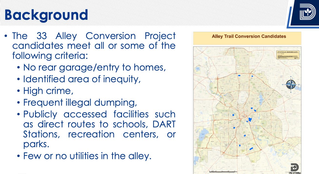 The City of Dallas has $4 million budgeted to convert these alleys, which are no longer used for trash and have few utilities. A city ordinance approved last year enables the city to enter maintenance agreements with homeowners.