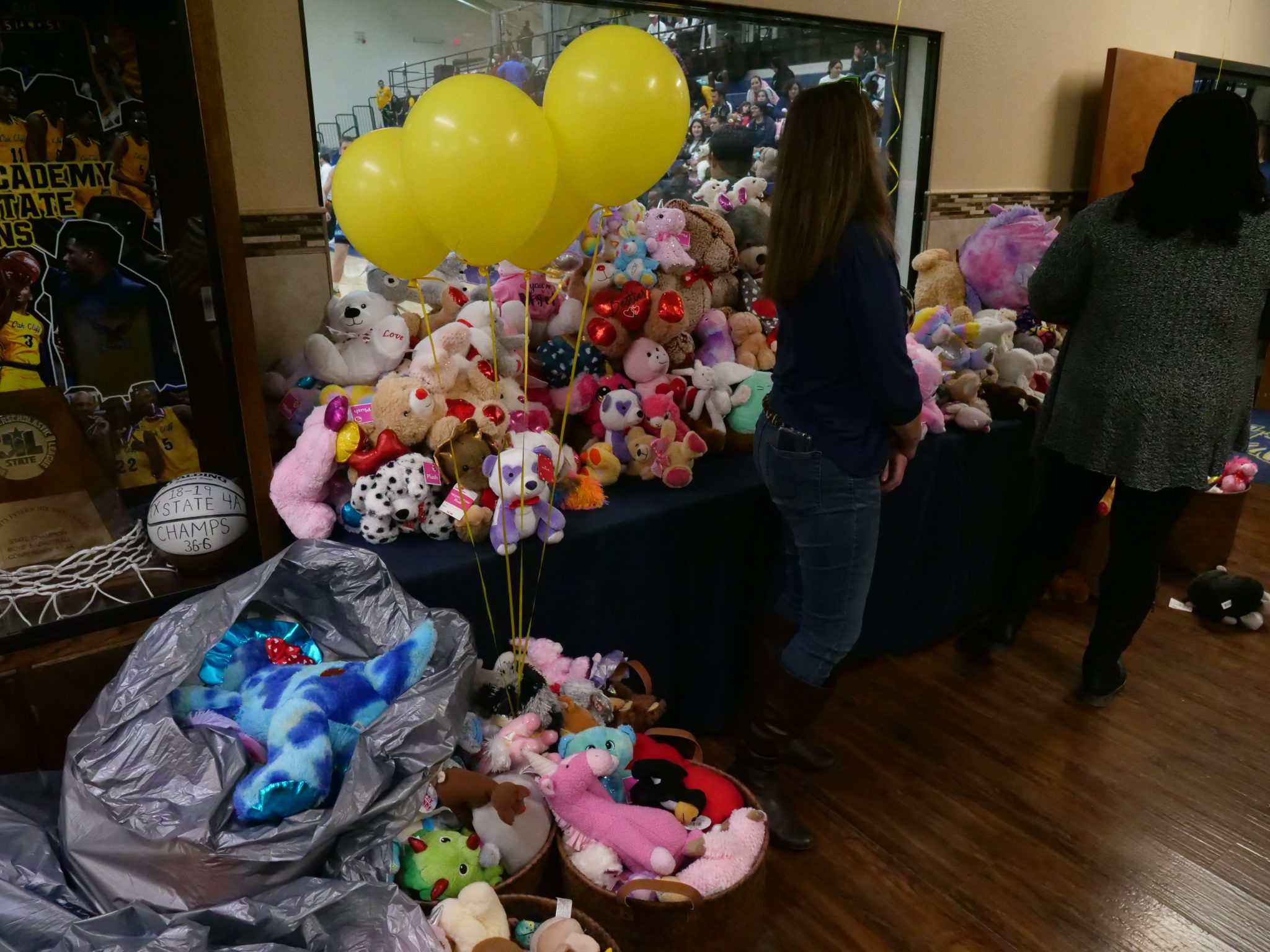 Admission was free to the Feb. 15 game at the school’s Teddy J. Purcell Court to anyone bearing a new stuffed toy.