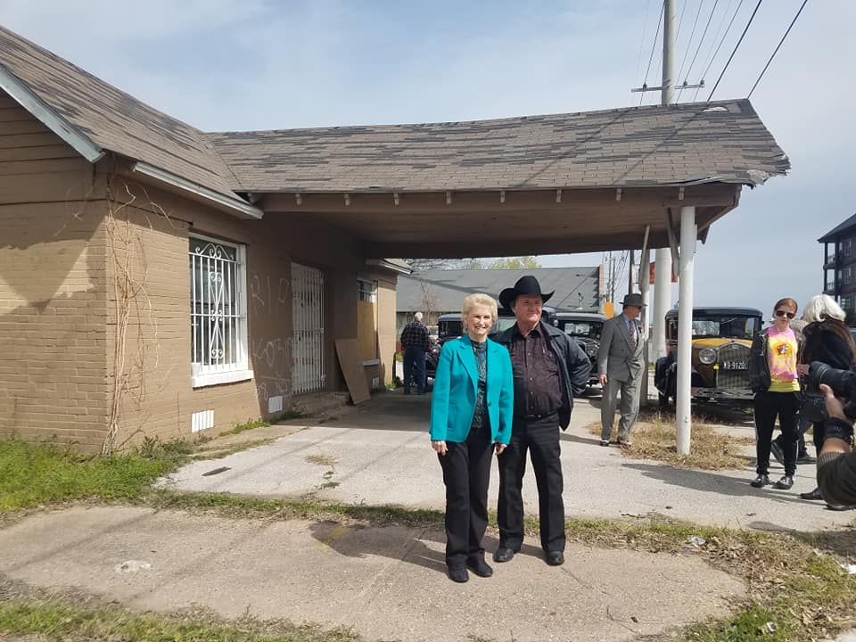 Rhea Leen Linder, the niece of Bonnie Parker, and Buddy Barrow, nephew of Clyde Barrow, at the Barrow filling station in March 2020. Photo courtesy of Bill Yates