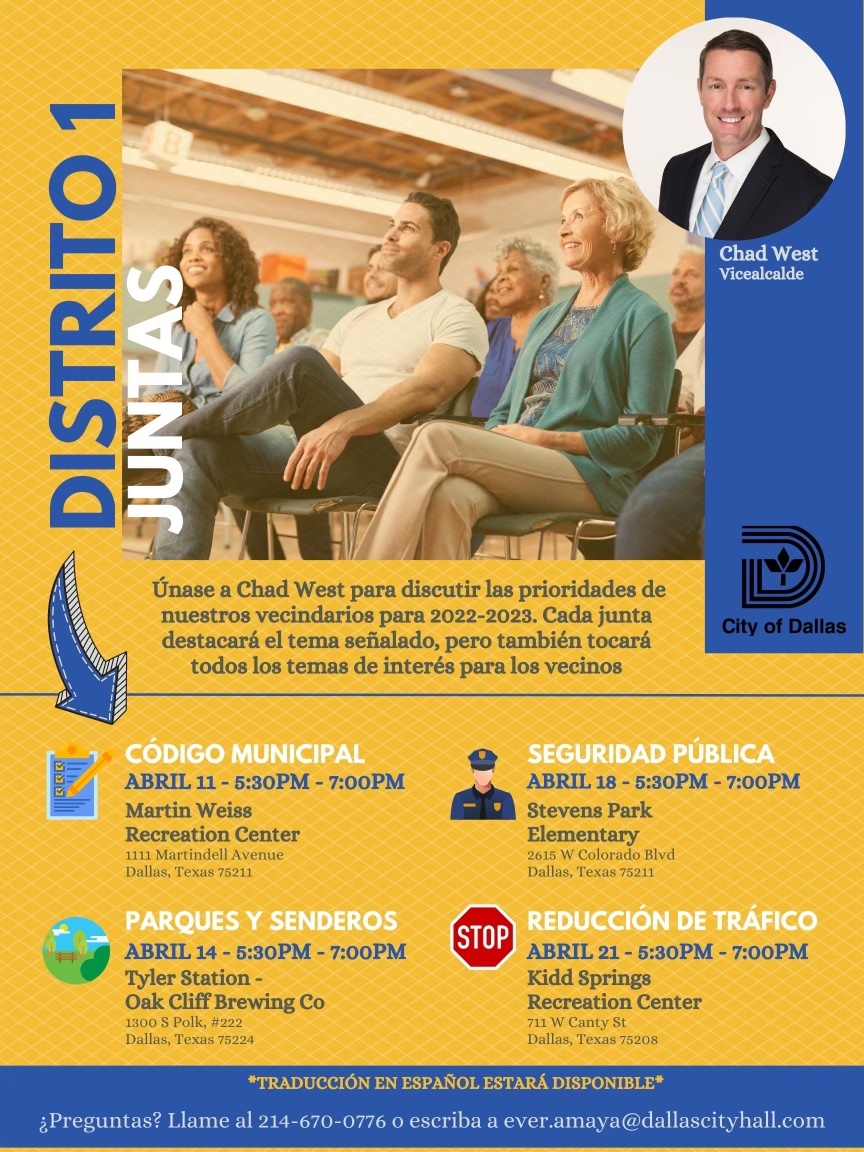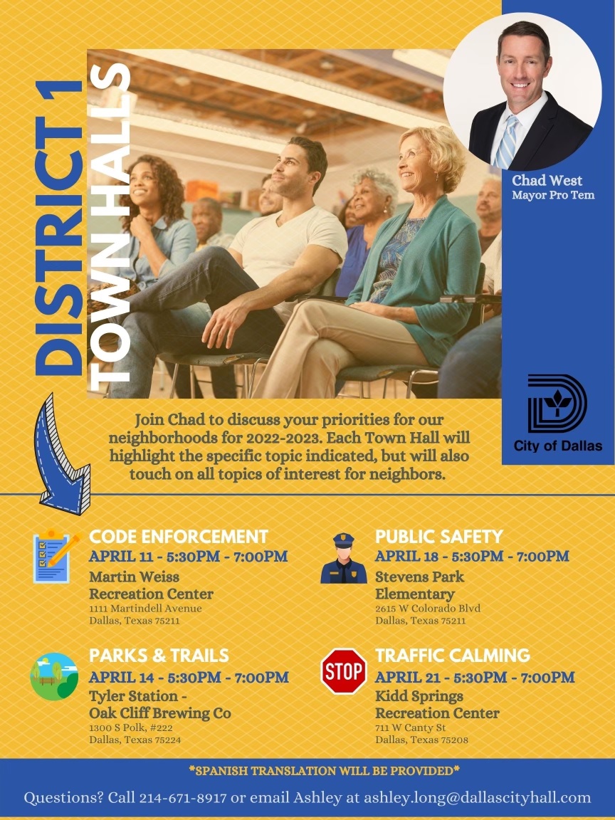 Mayor Pro Tem Chad West begins a series of town hall meetings on four neighborhood topics in District 1 tonight.