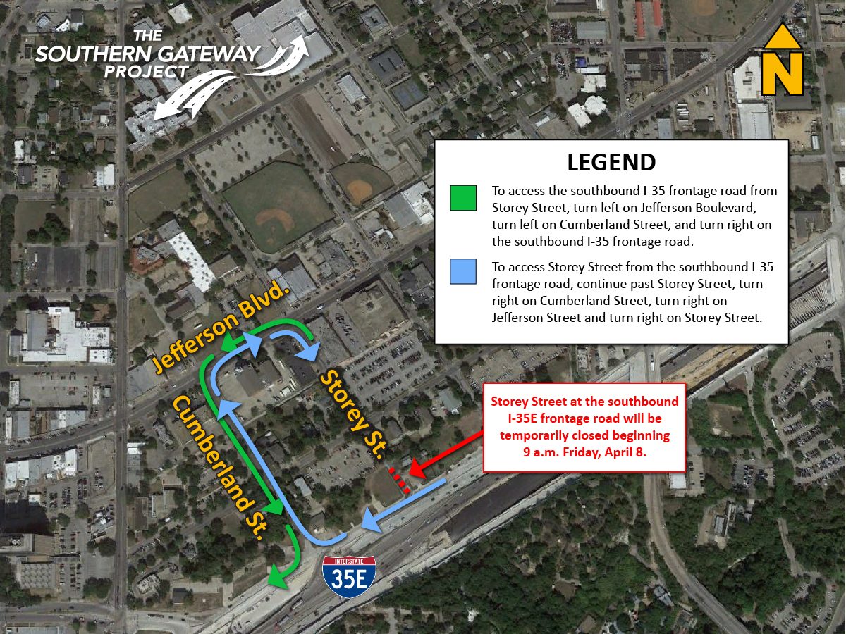 Storey Street at the southbound Interstate 35 frontage road will close temporarily beginning at 9 a.m. Friday, April 8.