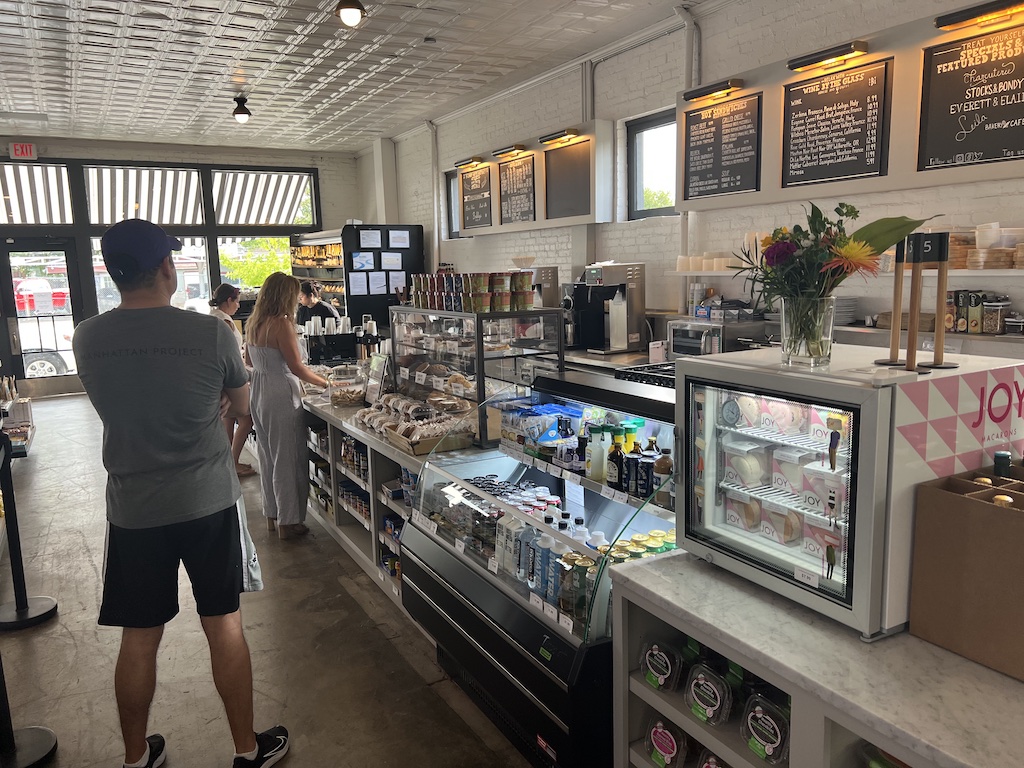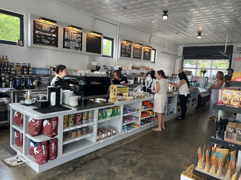 The coffee bar offers TacoDeli breakfast tacos, as well as sandwiches and baked items.