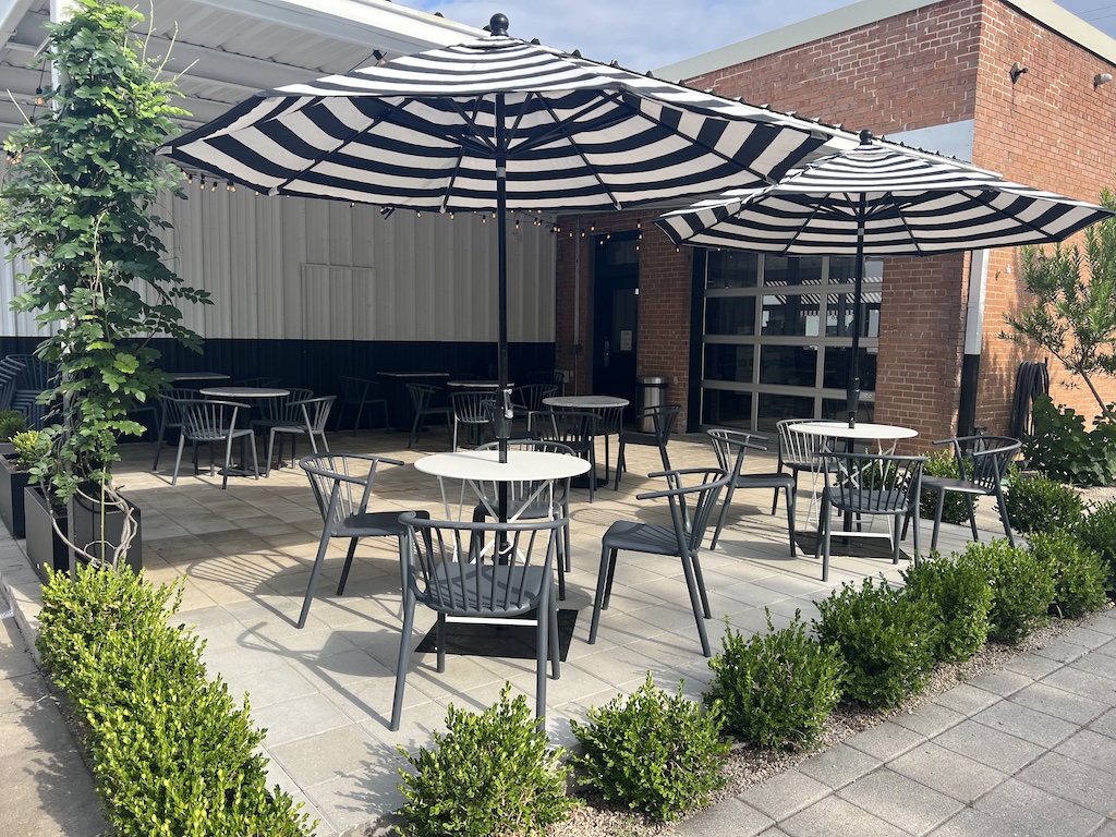 The updated facade of 634 W. Davis St. includes new awnings, tile work and a patio with seating.