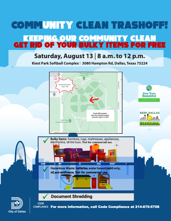Sponsored by the City of Dallas Keep Dallas Beautiful program, trash bags, gloves, safety vests and grabbers will be provided near the Kiest Park softball complex.