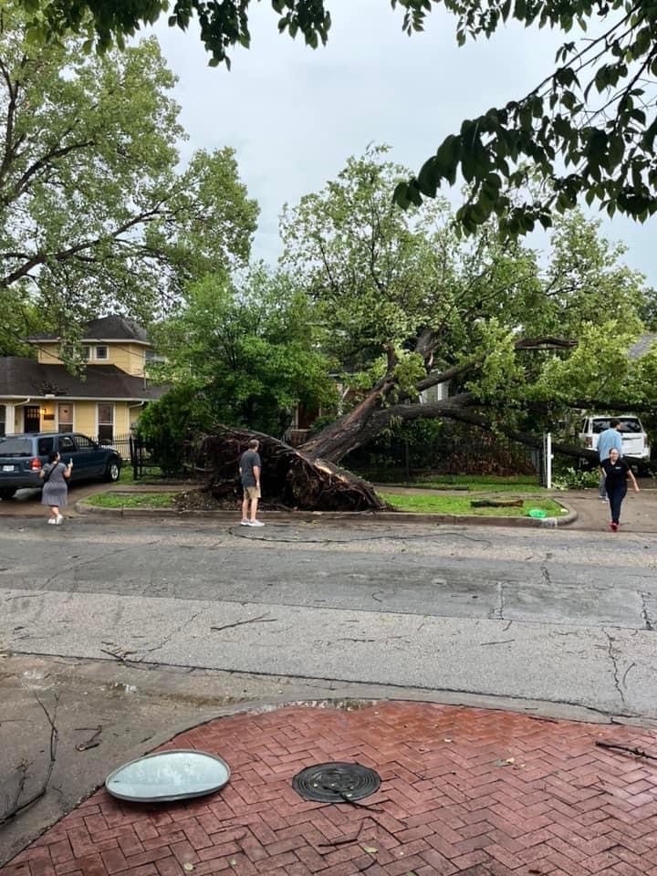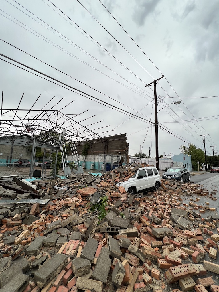 An exterior wall collapsed, covering a car with bricks in the Bishop Arts District, and trees were pulled out of the ground during a brief but vicious thunderstorm that knocked out power to businesses and homes in our neighborhood Sunday afternoon.