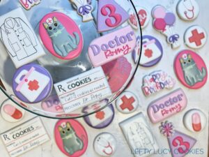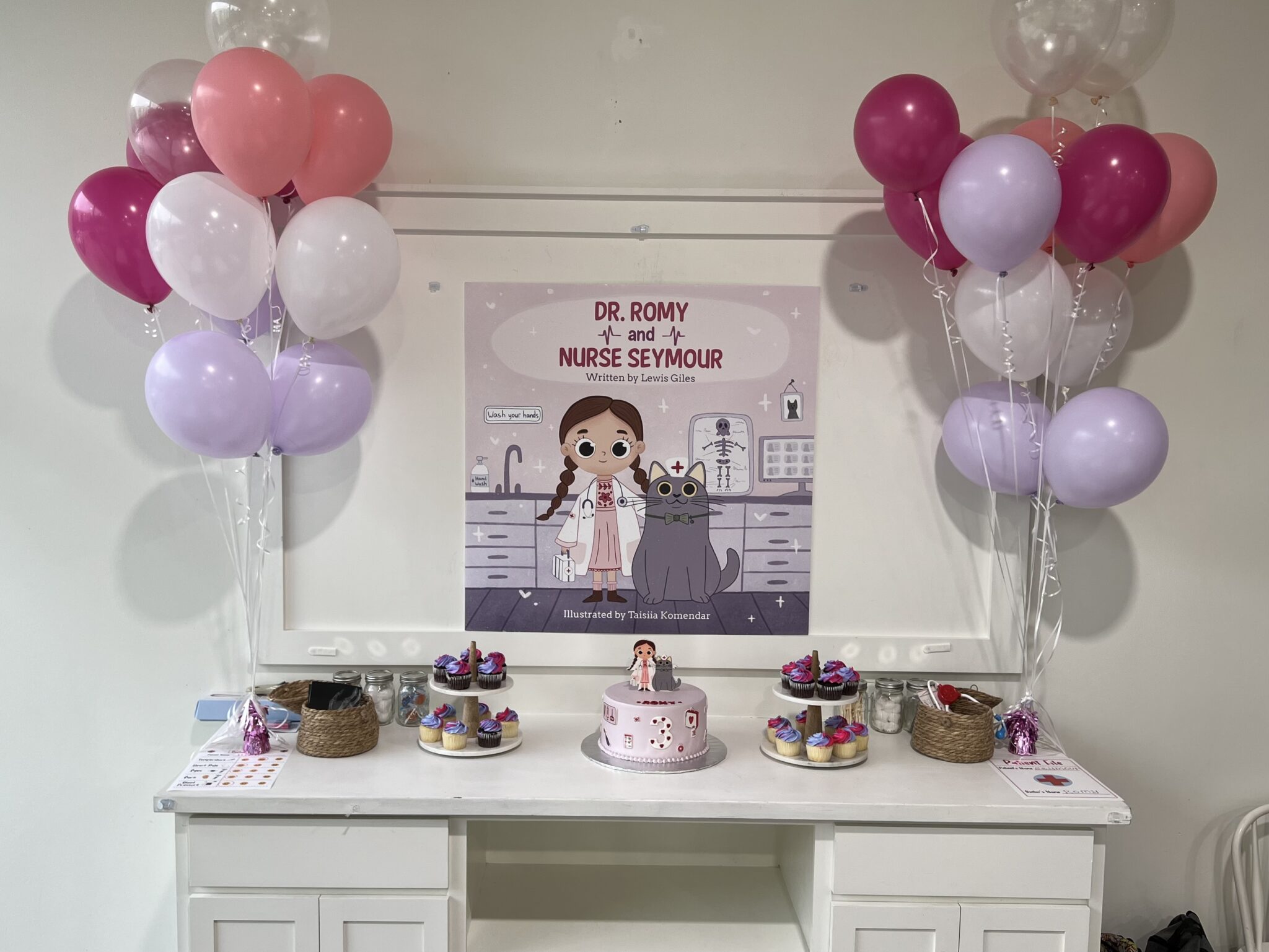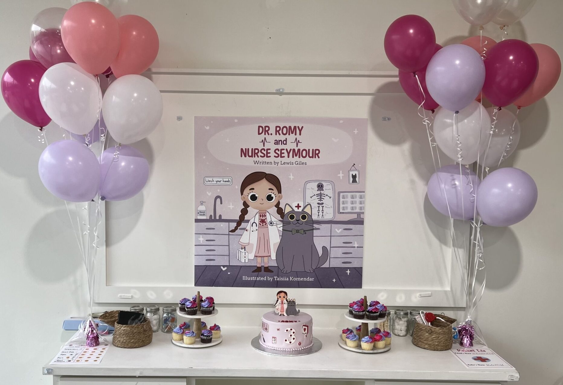 Giles said Romy loves to give out an unnecessary bandaid and play doctor, so a Dr. Romy themed party seemed appropriate. But to really emphasize the theme, Giles decided to write a children’s book about Dr. Romy and her sidekick, Nurse Seymour, inspired by the family cat.