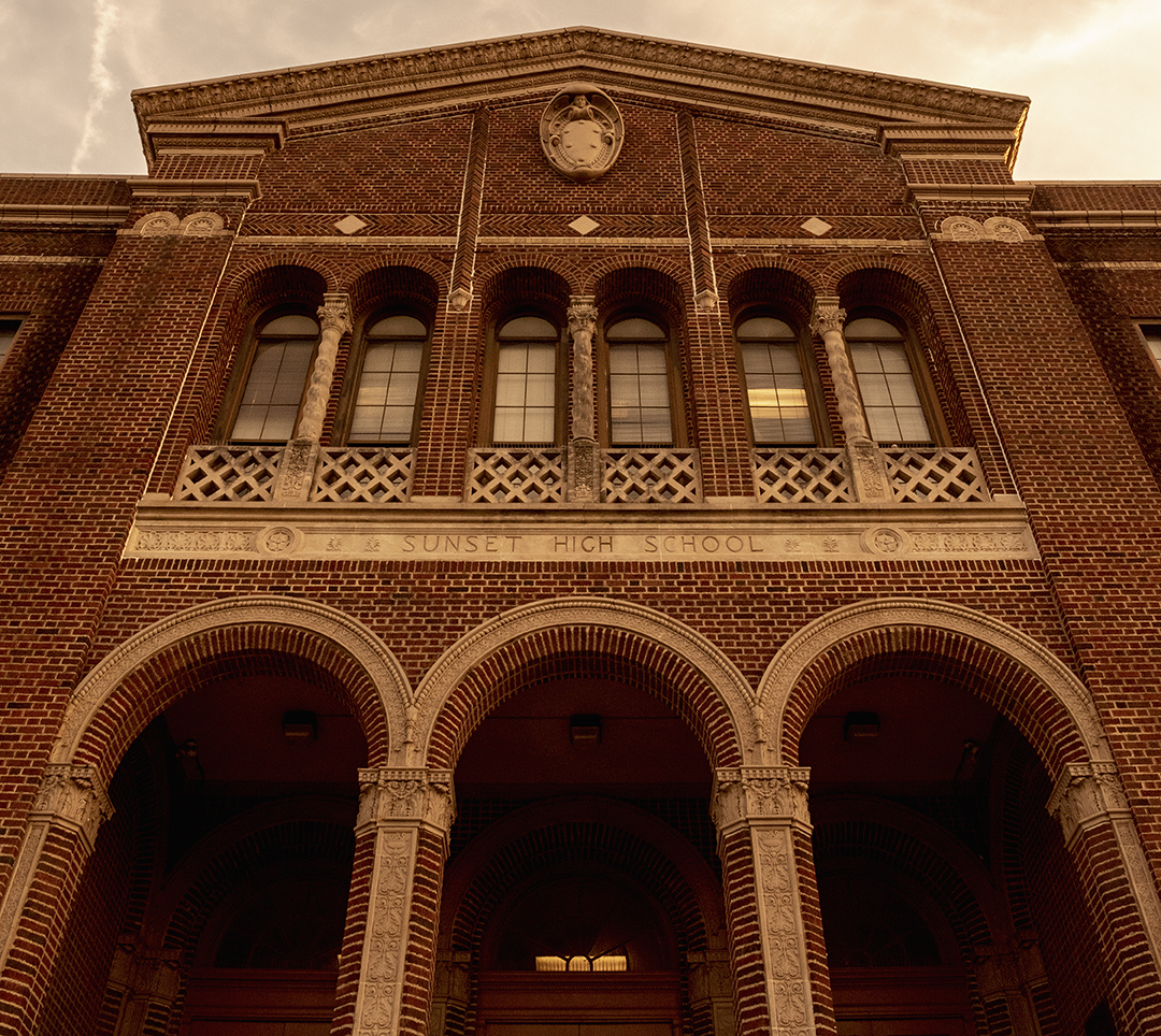 S is for Sunset High School. The purple and white of Sunset High School dates back to 1925, and the school is recognized as a Texas Historic Landmark. The 1950 football team clinched one of the four state championship wins achieved by a DISD team, and the athletic teams and extracurriculars at Sunset continue to impress to this day.