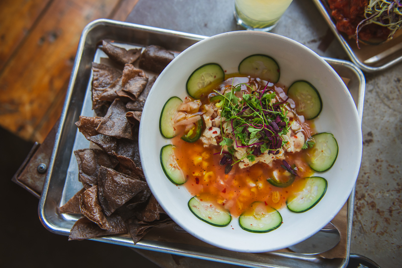 Similar in style and flavor to ceviche, the halibut aguachile is tossed in chili water rather than marinated in lime juice. Blue corn tortillas offer crunch.