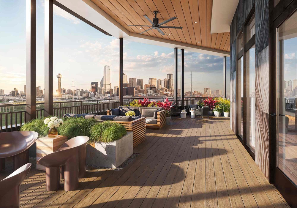 Oakhouse offers views of Downtown Dallas and energy-efficient appliances, quartz countertops, in-unit washer/dryers, as well as a resort-style swimming pool, sky lounge/view deck terrace, fitness center, dog park, coffee bar, meeting/zoom rooms and a common area lounge.