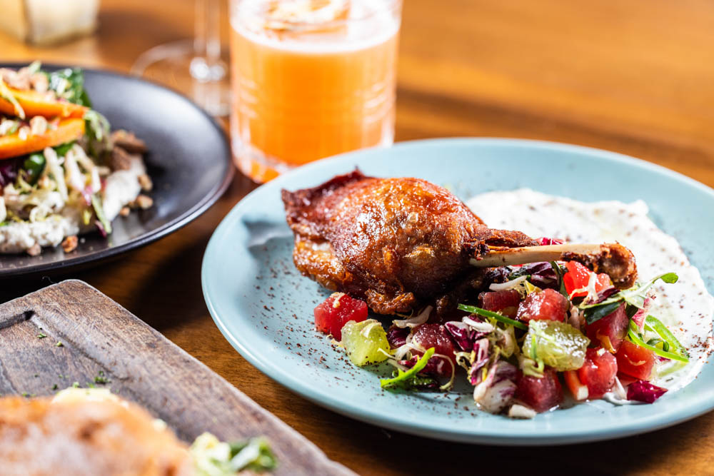 Duck-leg confit with melon salad, jalapenos, goat yogurt and sumac, and the Berkshire pork chop, an enormous portion served with poblano-cheddar grits, bacon and braised collard greens highlight the menu.