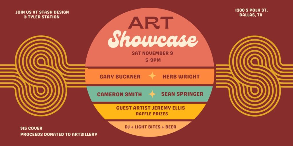 The showcase will feature local artists including Cameron Smith, Herb Wright, Gary Buckner, and Shawn Springer, with special guest artist Jeremy Ellis. All ticket proceeds will be donated to Artstillery, an Oak Cliff-based performing arts nonprofit that amplifies marginalized voices.