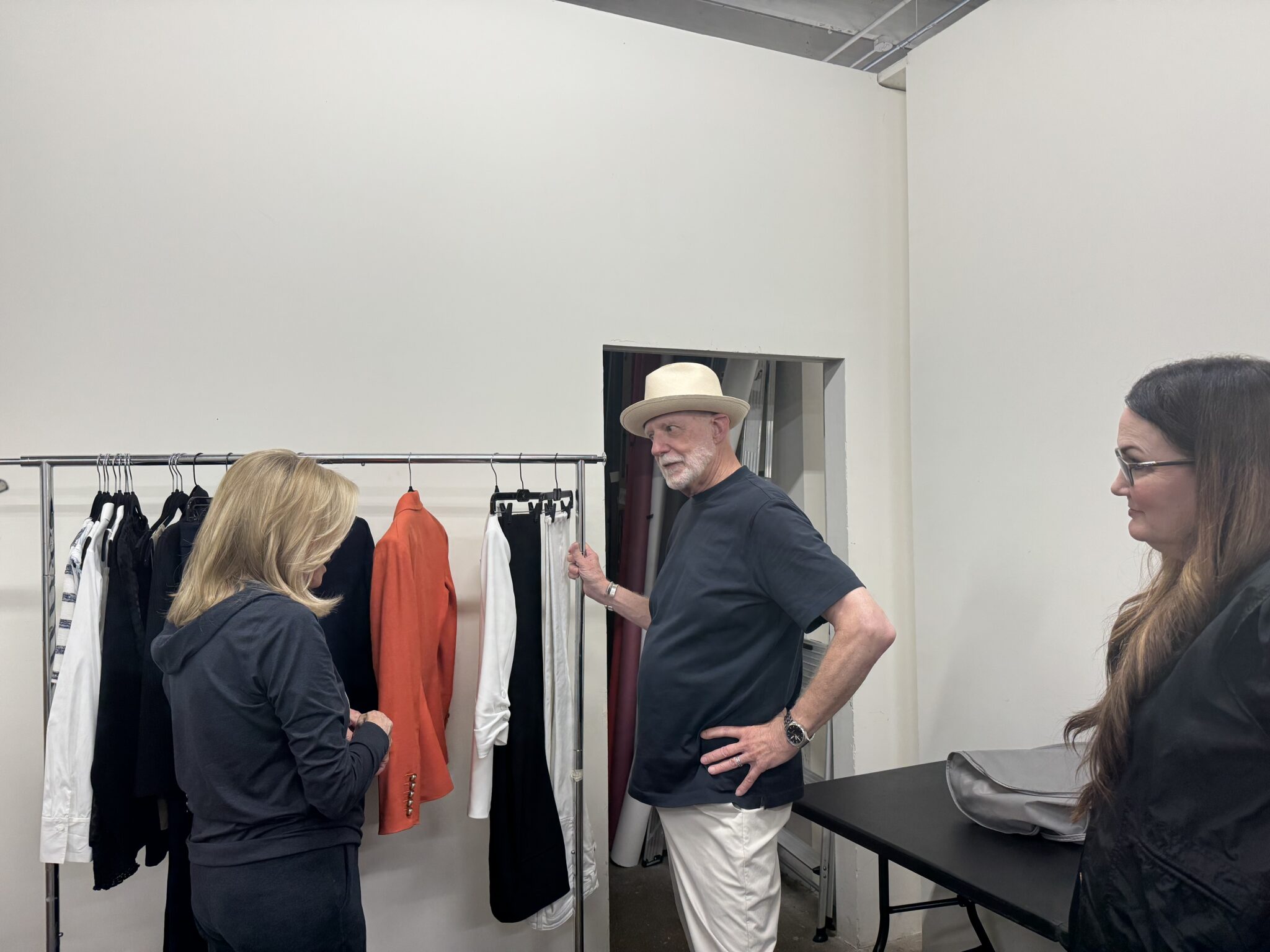 Kent, Jeanna and Jeannie surrounded the rack as they discussed the options to start the session, with Kent joking that ‘he cannot work this’ in an accent. They reference different pieces as something tight and full length, something great for a business look. Then it was off to the chair for Jeanna to work her magic.