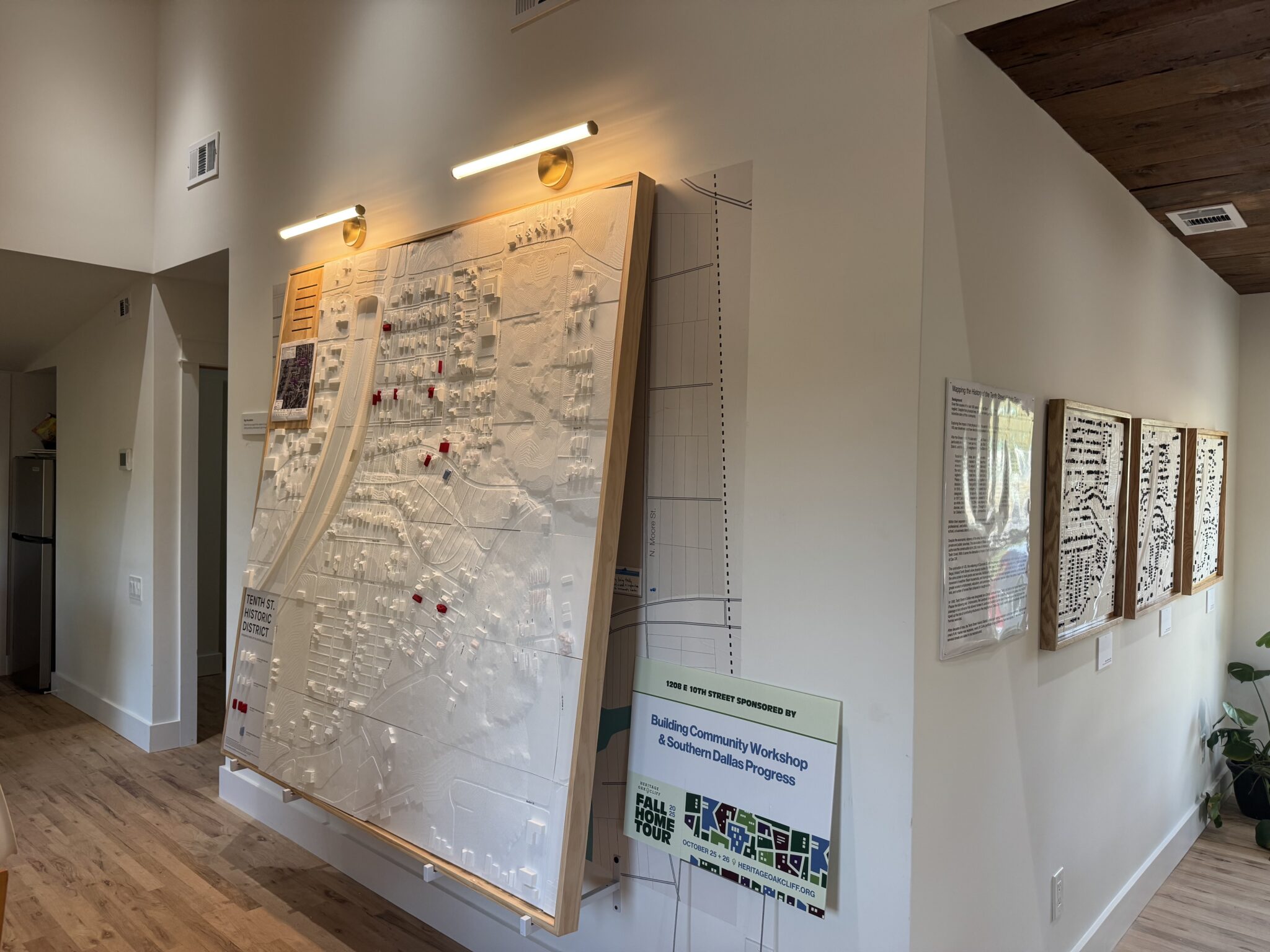 When the space is dormant from programming, the history takes center stage. Within the walls of the Little Blue House, displays of photos and maps bring to life the buried past. Most recently, they were on full display with the 2025 Heritage Oak Cliff Fall Home Tour. This was the first time any Tenth Street structure was featured for the event.
