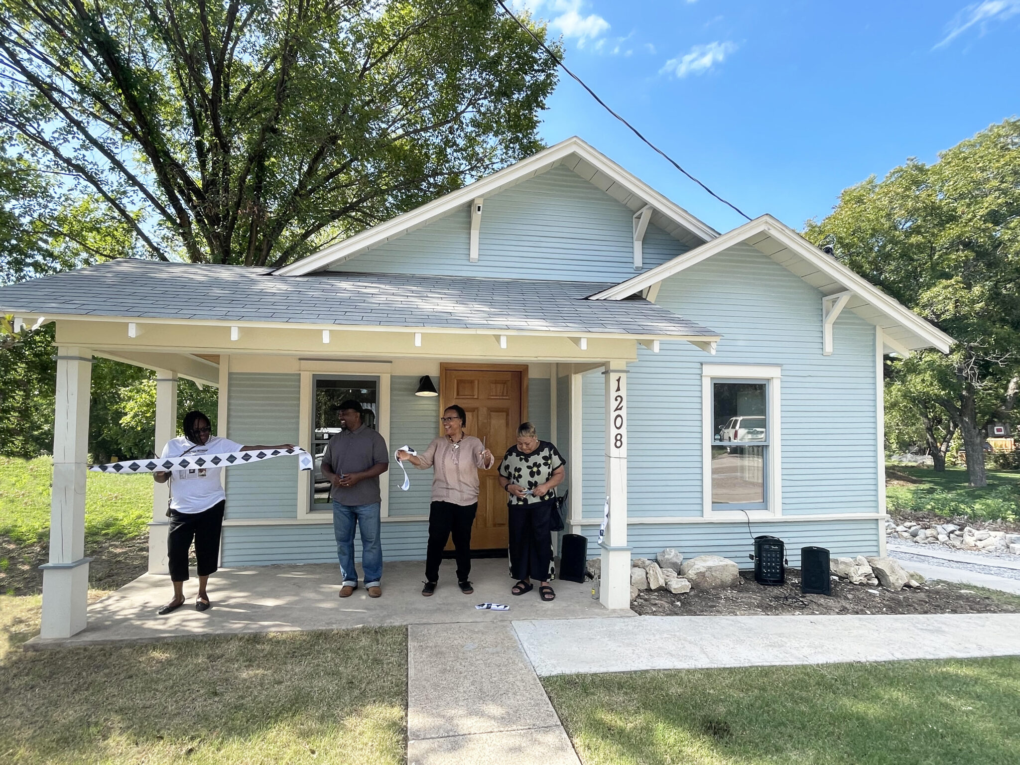 Ribbon cutting for the Tenth Street Neighborhood Resource Center, known as the Little Blue House. Photo courtesy of bcWORKSHOP.