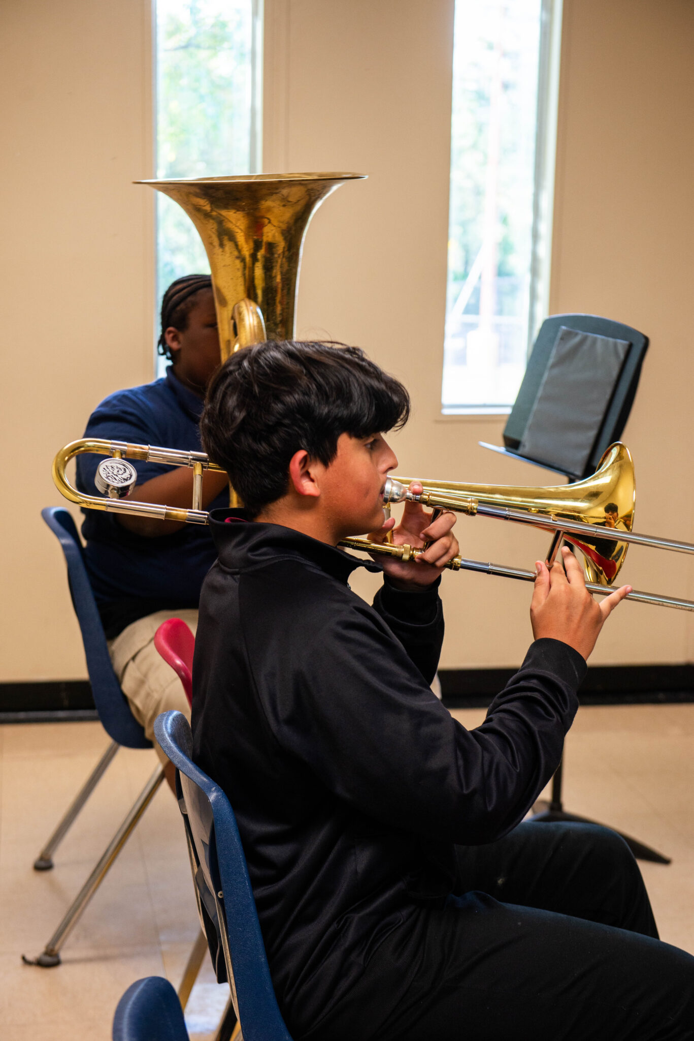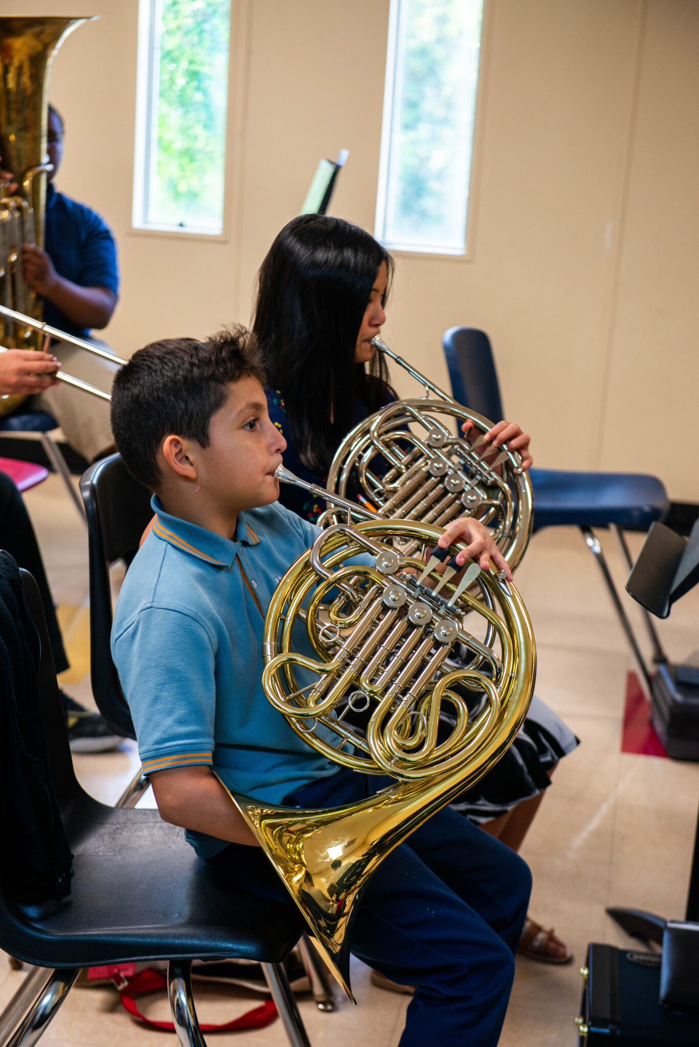 Seventh grader Graciela Doan has played the French horn for three years. She joined the program after seeing her friend practice the violin at home.