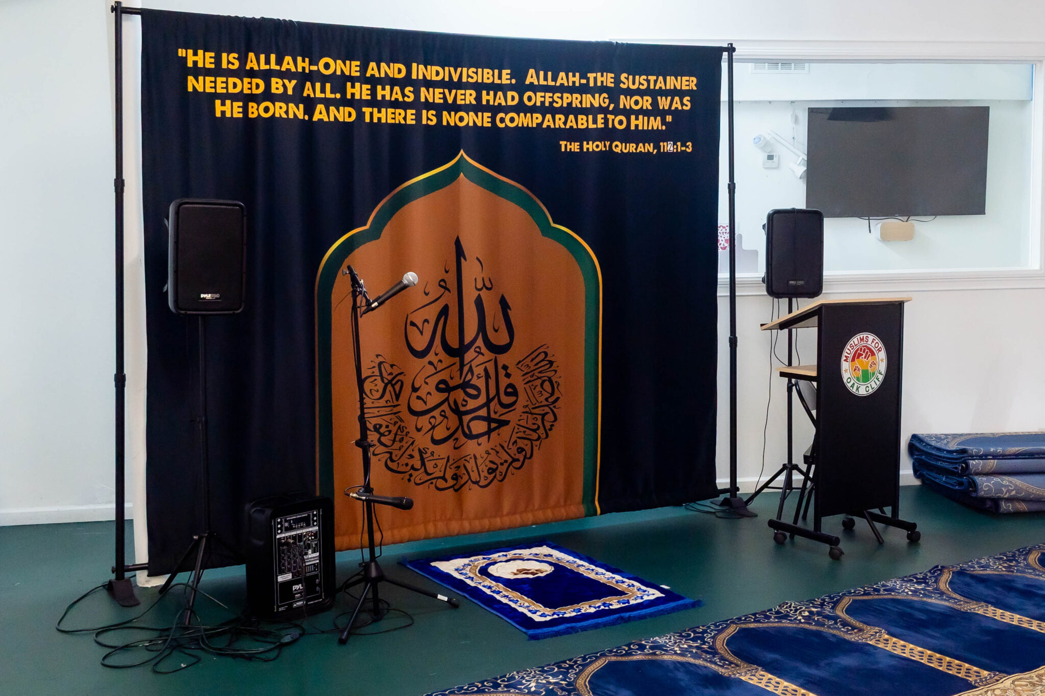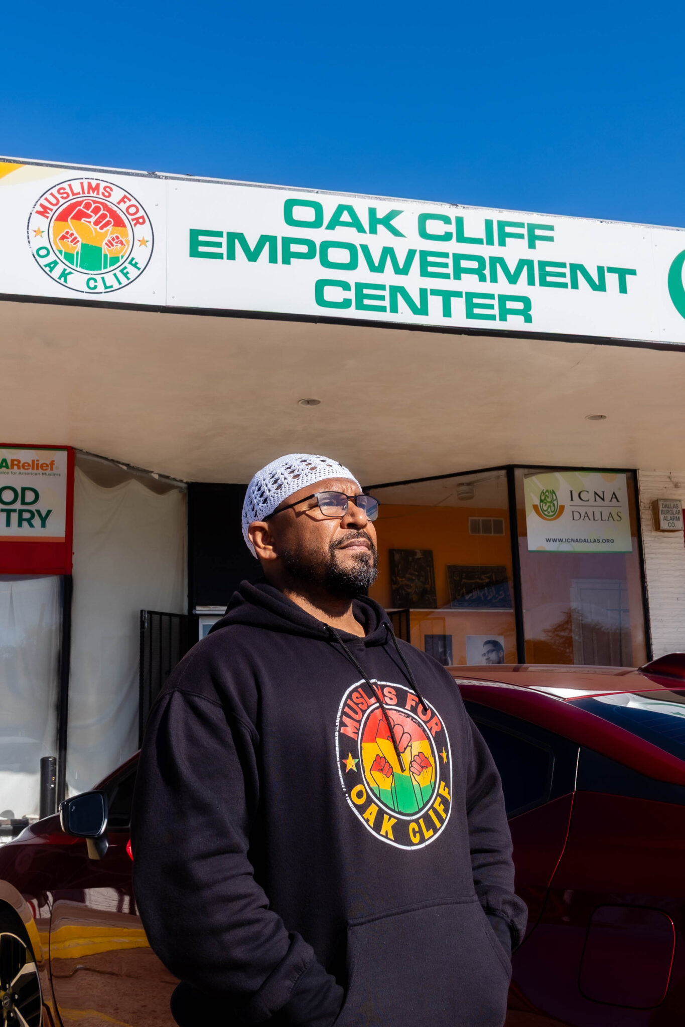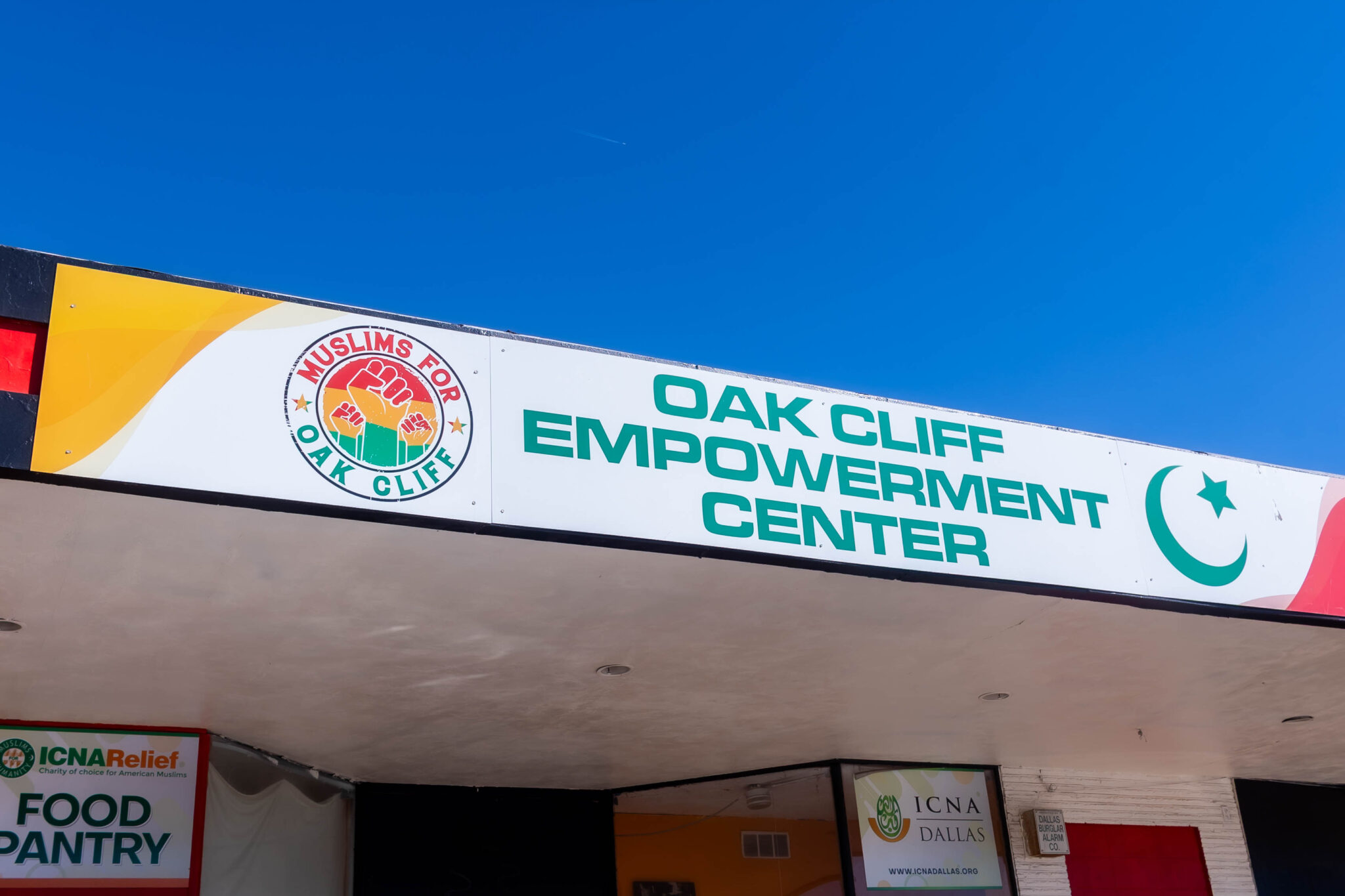 A red, yellow and green Black power salute circled by the phrase “Muslims for Oak Cliff” and a nod to the Ottoman empire’s Islamic identity with a crescent moon and star frame the building’s name: Oak Cliff Empowerment Center. A mosque that focuses on raising the banner of Islam in the very place they call home.