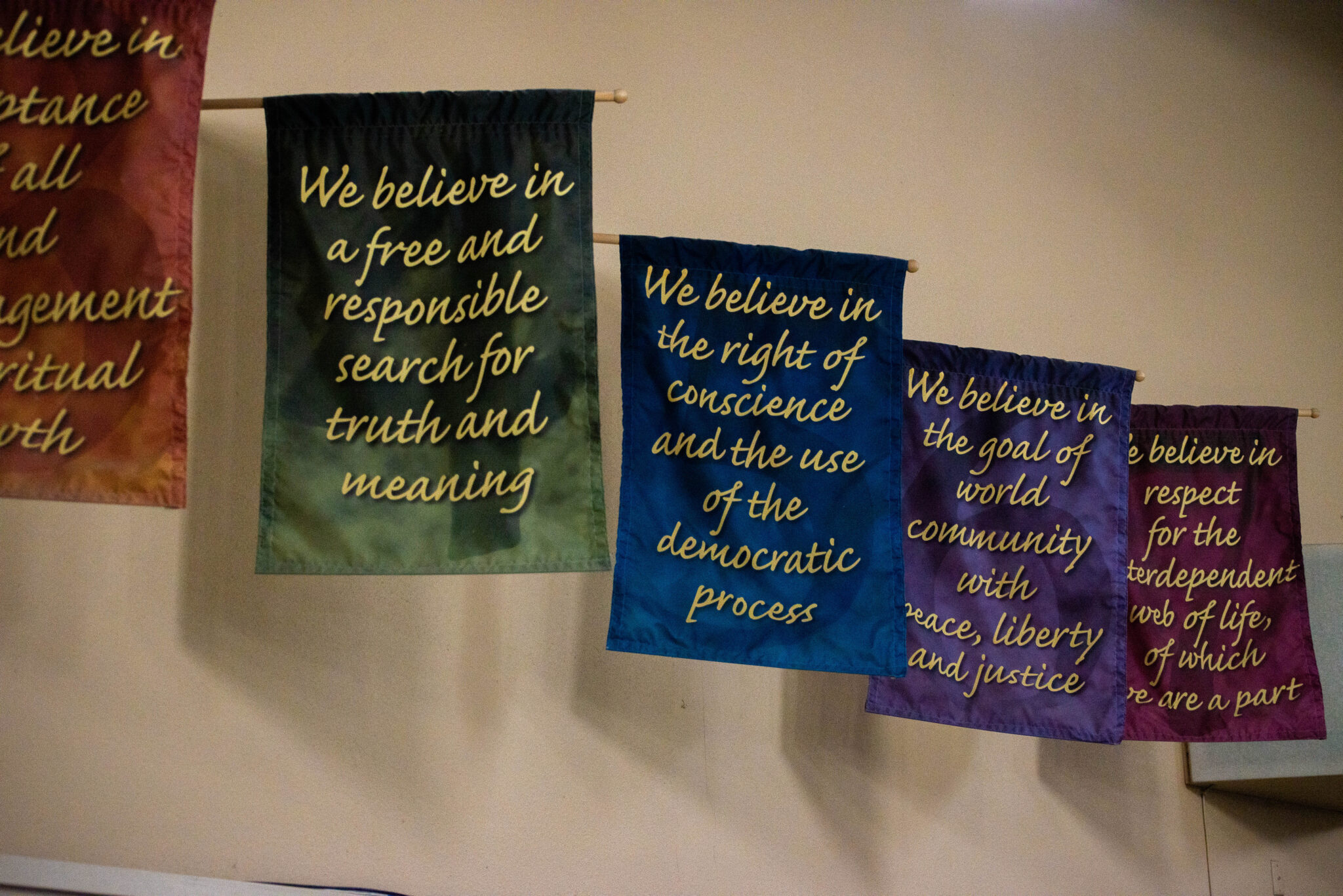 Inside, the lobby walls host photos of the congregation’s history. The actual sanctuary is a grand space, on the left The Seven Principles adopted by the Unitarian Universalist Association in 1985 hang.