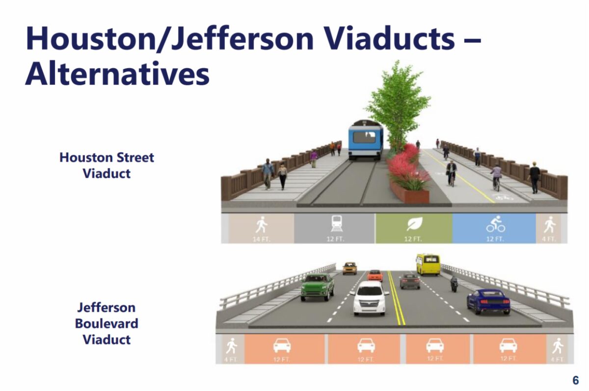 At the February meeting, the presentation included plans to convert the Houston Street Viaduct into a pedestrian bridge with a streetcar path and then move car transportation strictly on to the Jefferson Viaduct with two lanes southbound and two lanes northbound.
