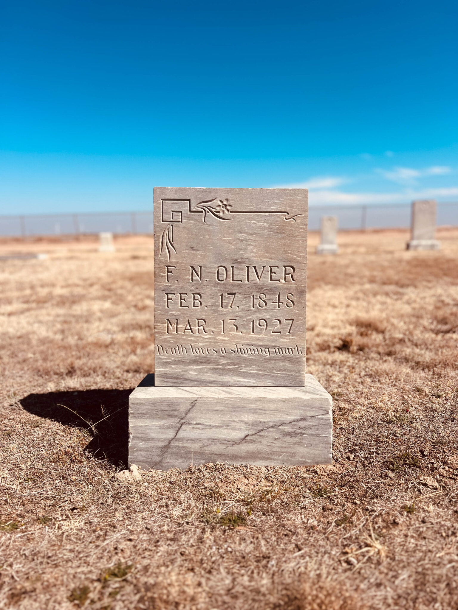 Two hours away from Pride, located in Lockney, Texas, Schubert and his wife found Oliver’s final resting place following his death in March 1927. Written on the stone is the phrase, “Death loves a shining mark.”