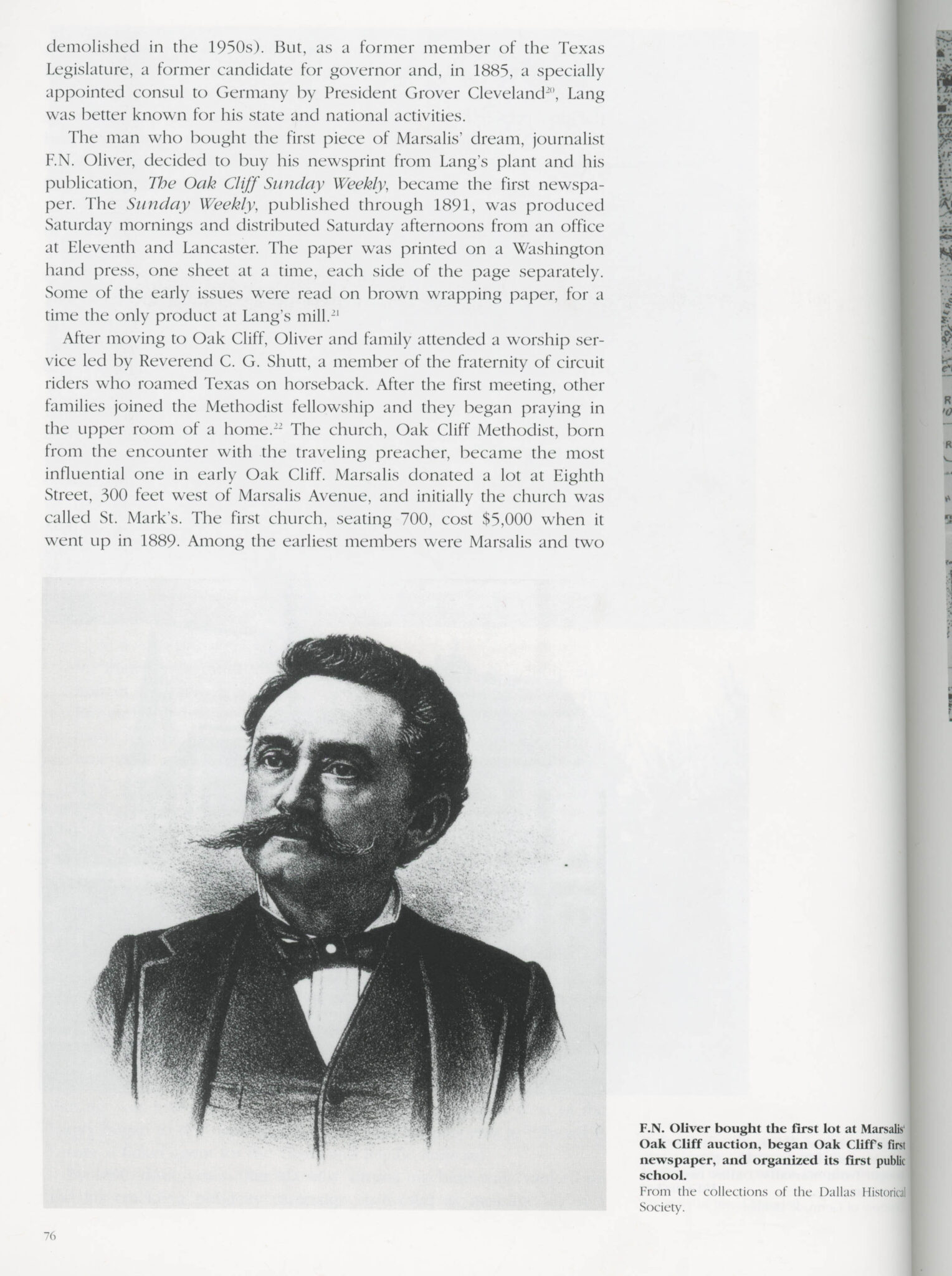 Oliver established the first one in our neighborhood, The Oak Cliff Sunday Weekly, which published through 1891. It was the first newspaper in Texas ever printed on paper manufactured in the state.