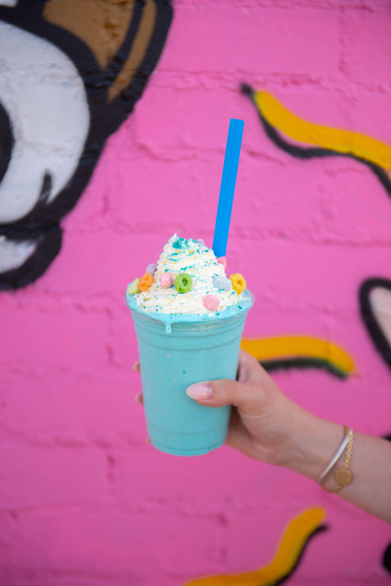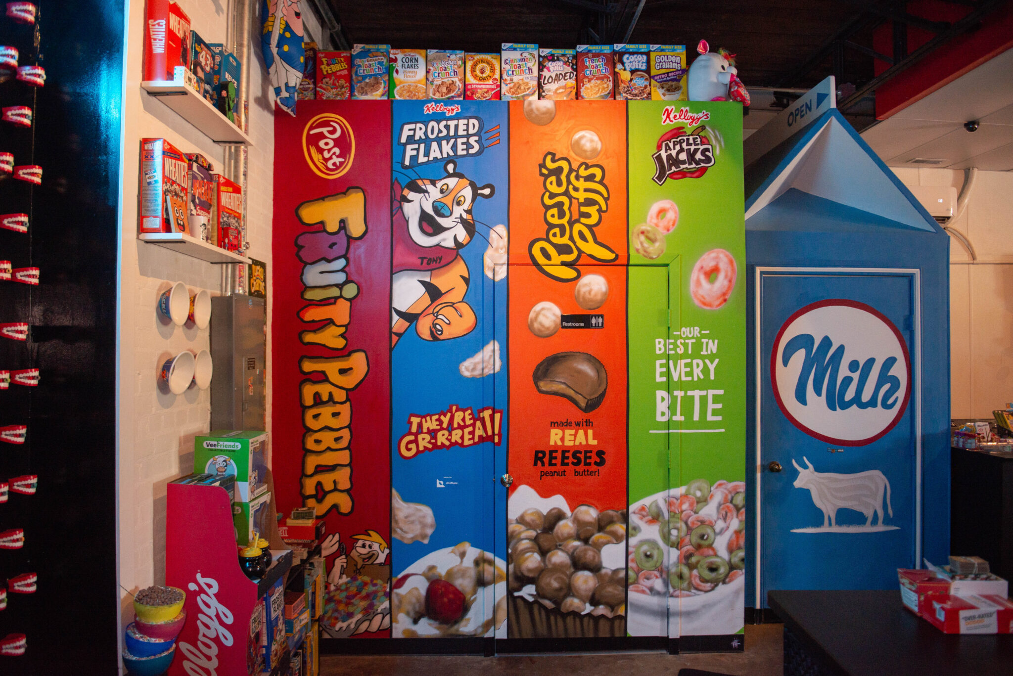 The walls are filled with murals, including a mystical wizard lounging with a cereal box in hand, displays of unique worldwide flavors, and the Fruity Pebbles, Frosted Flakes, Reese’s Puffs and Apple Jacks painted restroom entrance at the back corner of the shop.